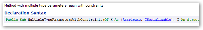 First, I totally overhauled the syntax preview generation so each preview style (NDoc or Sandcastle) uses the same syntax preview engine. As part of that, I added a bunch more testing and support for complex syntax like multiple type parameters with multiple type constraints per parameter. What? What does that mean? It means you can see stuff like this in your preview: